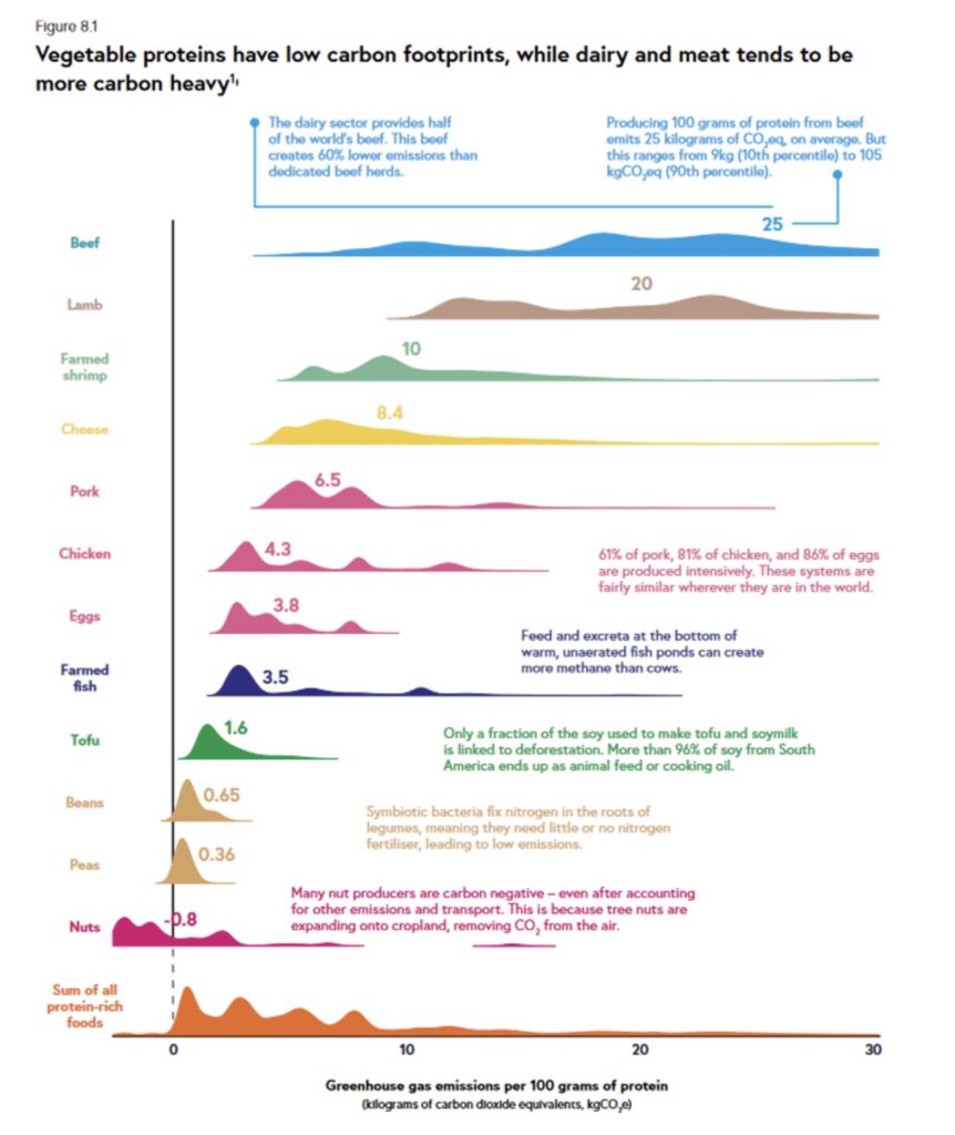 - Introduce students to two important figures on food emissions. First show the students an image of emissions from different food types (first image below) and then a figure of global meat consumption (second image below).